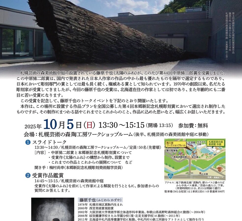 26Sep2025 発表系 中原悌二郎賞受賞記念 受賞記念としてトーク企画を行うこととなりました。 ネットにはちょっと載せられない初期の作品写真や、影響を受けたもの、受賞作品のできるまでなど、色々とお見せしたいと思っております。 是非お越しください!! ︎ ︎ ︎ ︎ ︎ ︎ ︎ ︎ ︎ ︎ ︎ ︎ ︎ 11月23日には旭川彫刻美術館で贈呈式と記念講演も行...